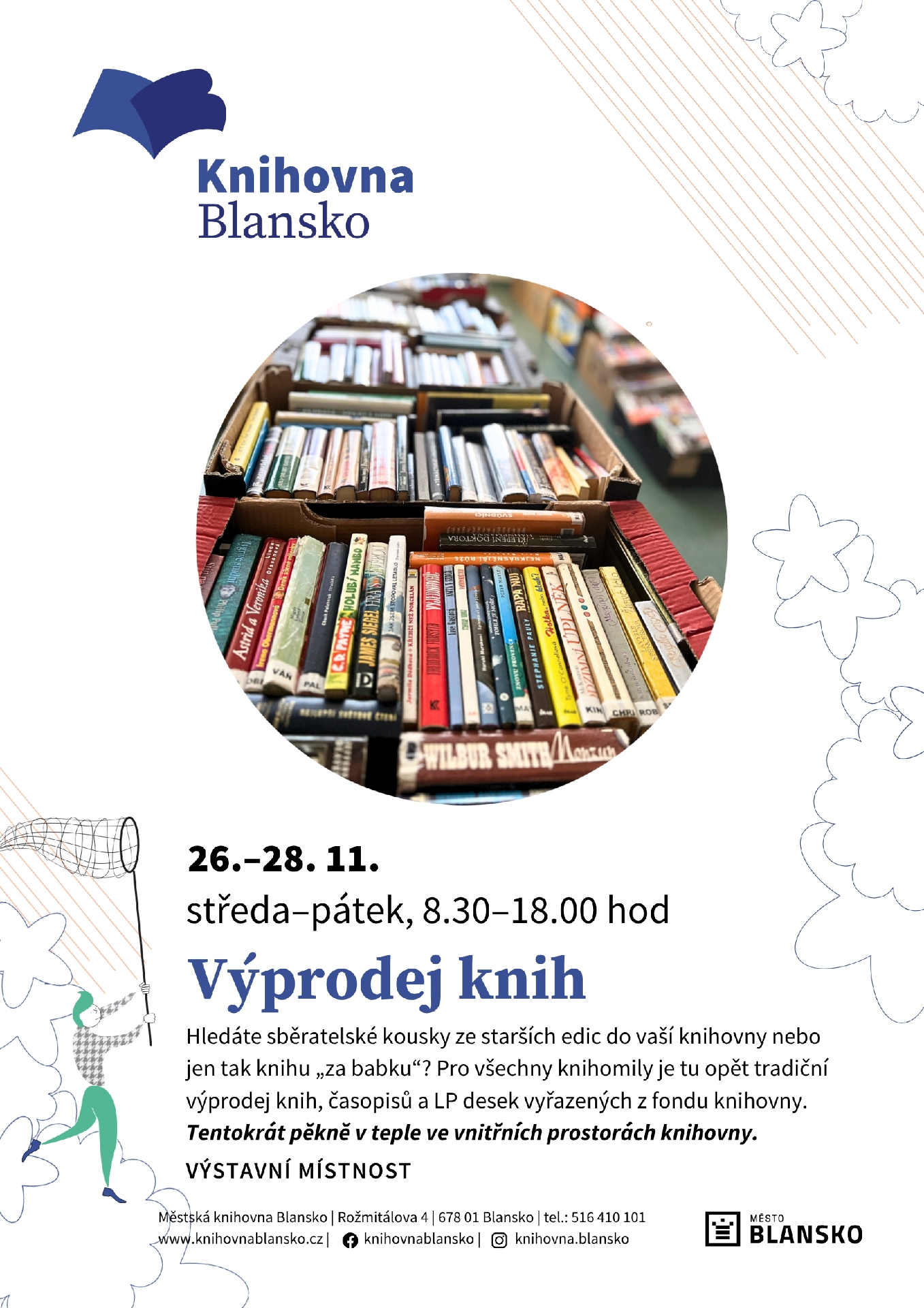 Pro všechny knihomily je tu opět tradiční výprodej knih, časopisů a LP desek vyřazených z fondu knihovny a to v ceně 5 Kč za kus. Tentokrát pěkně v teple ve vnitřních prostorách knihovny.