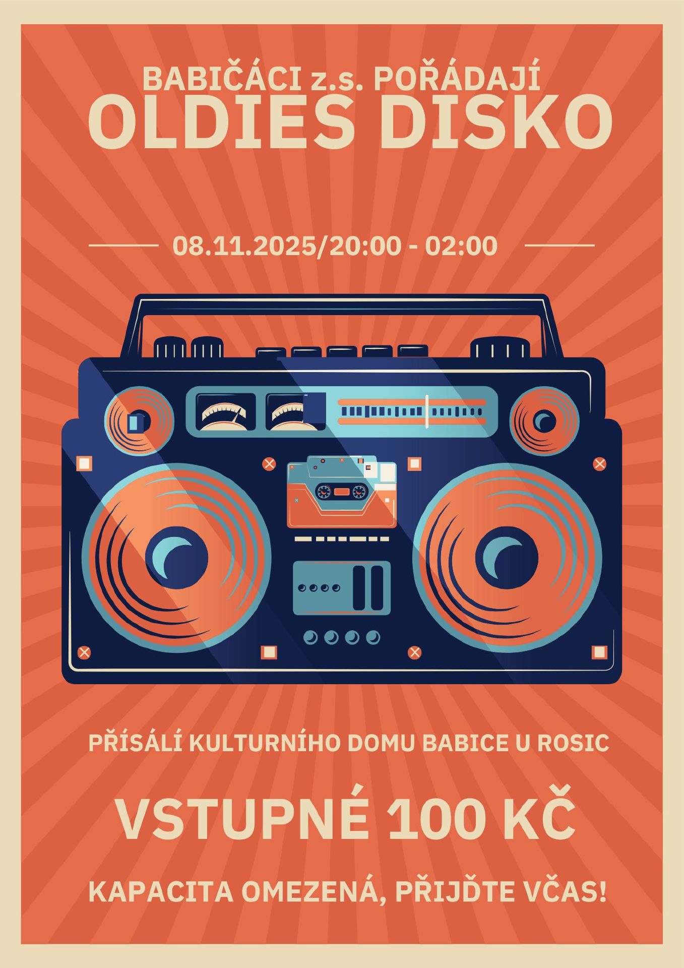 Přijďte rozhýbat svoje kosti na muziku z 80. a 90. let do přísálí kulturního domu v Babicích. Vstupné 100Kč. Hraje DJ Foral. Kapacita omezena. Srdečně zvou Babičáci z.s.