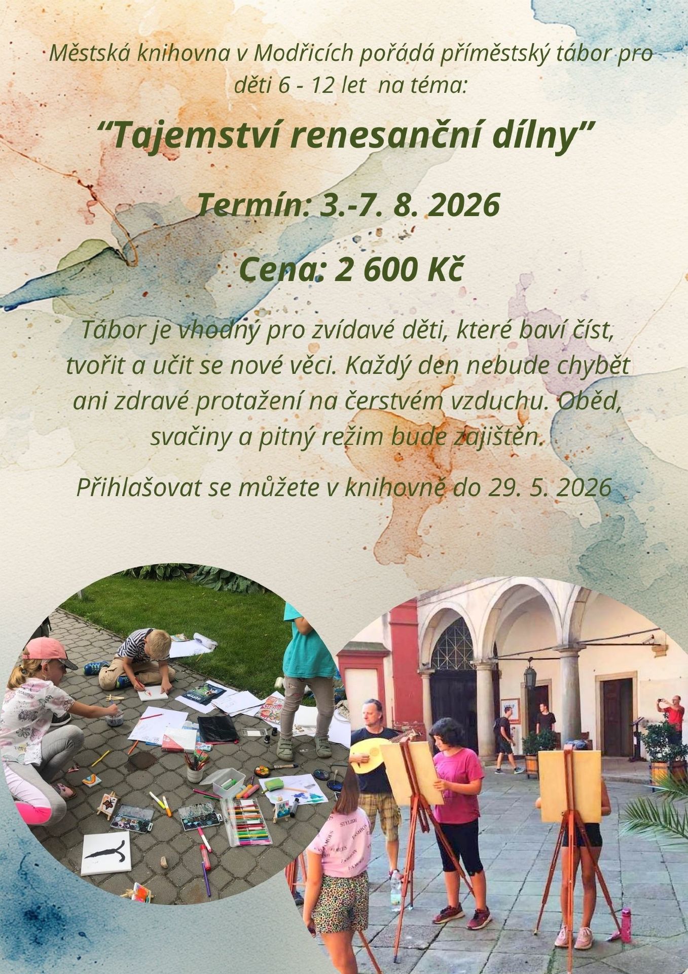 Městská knihovna v Modřicích pořádá příměstský tábor pro děti 6-12 let. Tábor je vhodný pro zvídavé děti, které baví číst, tvořit a učit se nové věci. Každý den nebude chybět ani zdravé protažení na čerstvém vzduchu. Oběd, svačiny a pitný režim bude zajištěn. Cena tábora je 2 600 Kč.