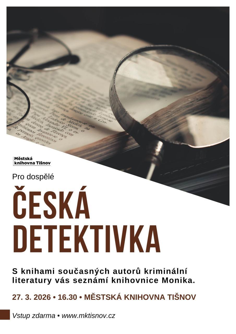 Pá 27.03.2026 16:30 - 18:00 diskuzní večer Městská knihovna Tišnov bez vstupného - Diskuzní večer z cyklu LiteraTúra aneb Putování světem knih Brzy uplyne 100 let od chvíle, kdy vyšla první ryze česká detektivka z domácího prostředí. S knihami současných českých autorů kriminální literatury vás seznámí knihovnice Monika.