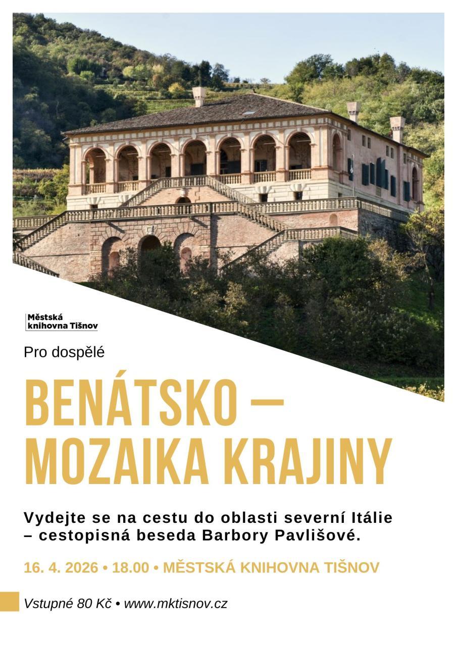 Čt 16.04.2026 18:00 - 20:00 cestovatelská přednáška Městská knihovna Tišnov 80,- Kč - Cestopisná beseda Barbory Pavlišové Často jí pouze projíždíme cestou do Benátek, k italským plážím nebo dál na jih. Přitom Benátsko je ideální krajina, která má snad vše, co si můžeme přát.