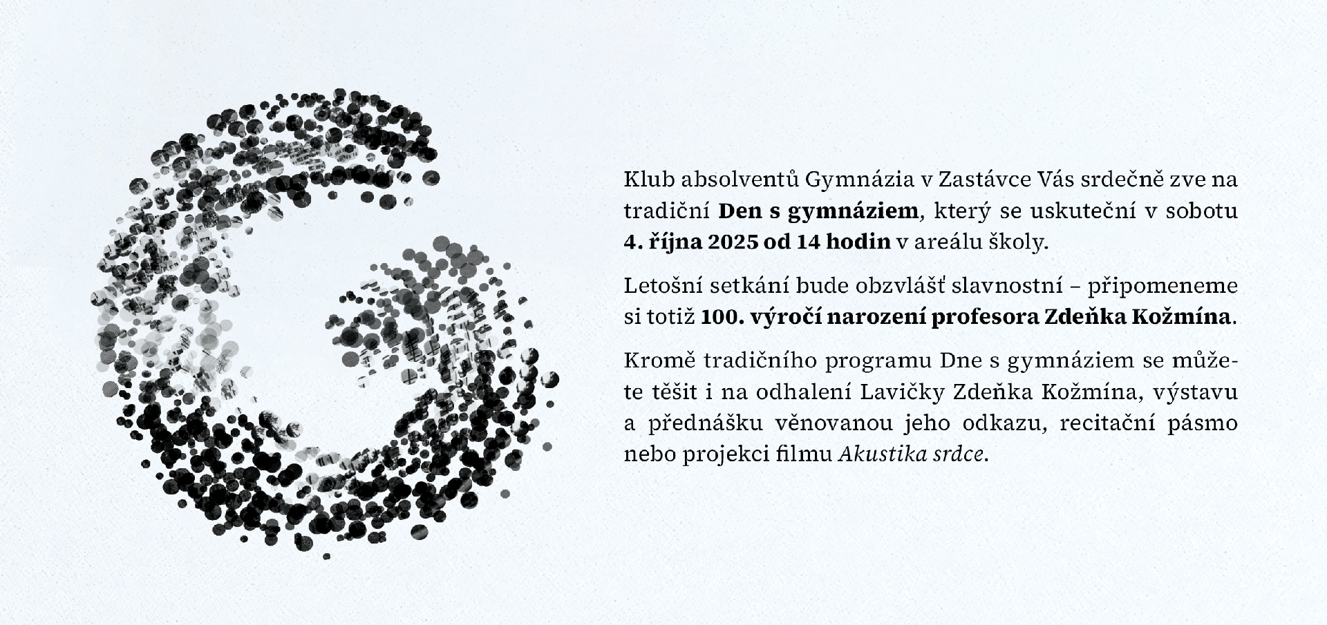 Klub absolventů Gymnázia v Zastávce Vás srdečně zve na tradiční Den s gymnáziem, který se uskuteční v sobotu 4. října 2025 od 14 hodin v areálu školy.