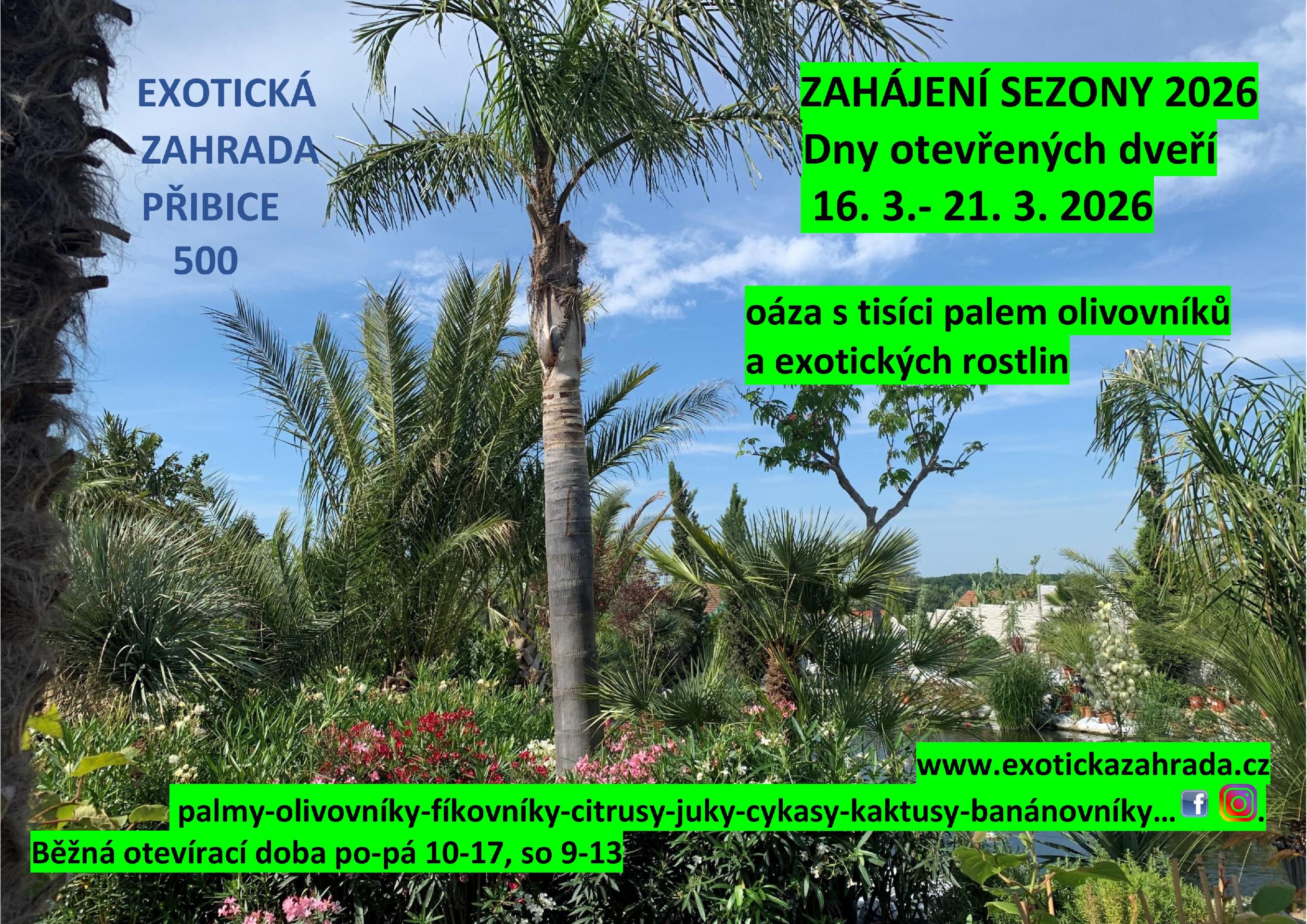 „Zveme Vás na zahájení letošní sezony - jarní dny otevřených dveří do Exotické zahrady Přibice. Adresa Přibice 500. Zahrada je plná velkých palem desítek druhů včetně mrazuodolných, plodících olivovníků, kiwi a fíkovníků, obřích stromových juk stromových kapradin, kaktusů, cykasů, banánovníků, pokojovek a spousty exotických rostlin. Exotické rostliny od malých sazenic po šestimetrové palmy si můžete nejen v tento den zakoupit za výhodné ceny. Olivovníky na kmínku i silné staleté stromy, palmy od semenáčků, až po monumentální velikosti, tisíce pokojových rostlin, exotické ovocné rostliny. Nahlédnout do zahrady můžete také prostřednictvím fotogalerie na www.exotickazahrada.cz. Provozní doba zahrady všední dny 10-17, sobota 9-13. Děkujeme za sdílení a těšíme se na návštěvu.