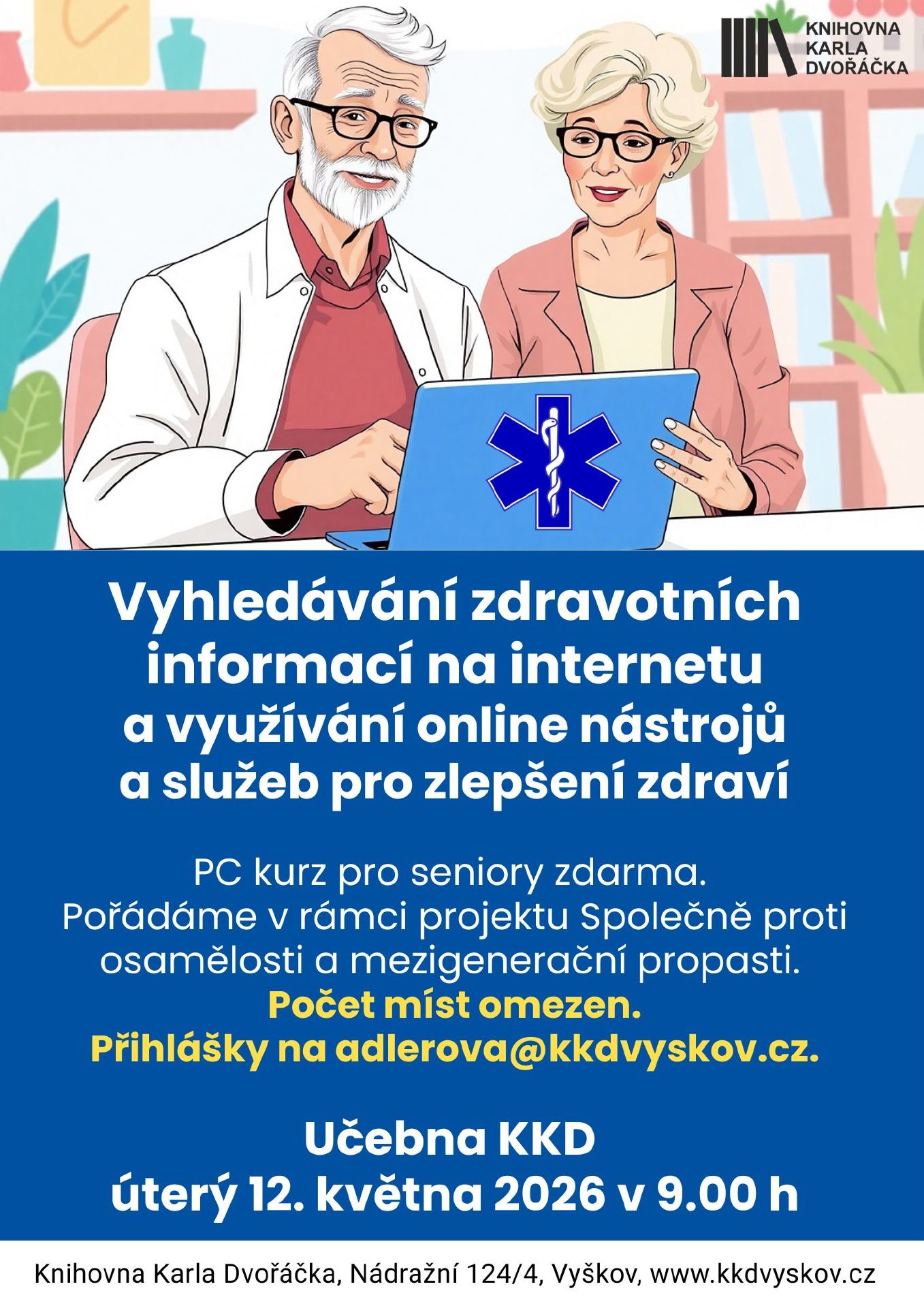 Vyhledávání zdravotních informací na internetu a využívání online nástrojů a služeb pro zlepšení zdraví. PC kurz pro seniory zdarma. Pořádáme v rámci projektu Společně proti osamělosti a mezigenerační propasti. Počet míst omezen. Přihlášky na adlerova@kkdvyskov.cz.