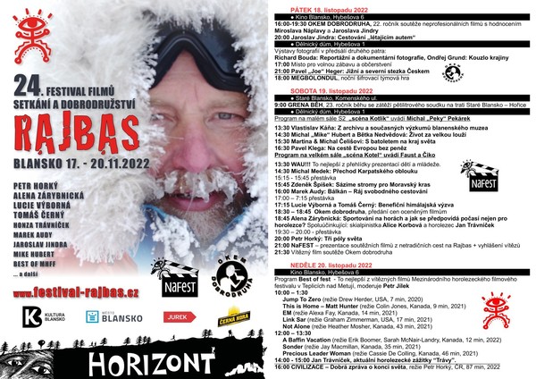 Rajbas zůstává především filmovým festivalem a do této koncepce zapadá uvedení výpravného dokumentu CIVILIZACE režisérem snímku Petrem Horkým a projekce BEST OF FEST nejlepších filmů z partnerského Mezinárodního horolezeckého filmového festivalu v Teplicích nad Metují. A samozřejmě tradiční filmové soutěže OKEM DOBRODRUHA (22. ročník soutěže neprofesionálního filmu) a NaFEST (prezentace netradiční cesty na festival). V porotě Okem dobrodruha zasedne tradičně Miroslav Náplava (Prima ZOOM, Srdcaři.cz) a letos také Jaroslav Jindra (Česká televize, cyklus Na cestě a Objektiv).