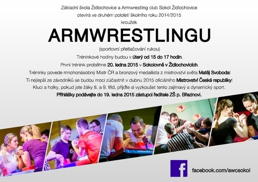 Sokol Židlochovice ve spolupráci se ZŠ Židlochovice od 20. ledna otevírá kroužek armwrestlingu. Co se za tímto názvem skrývá? V přesném překladu do češtiny to znamená přetlačování rukou, pro každého Čecha stará známá páka.