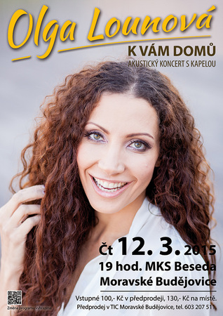 Již za tři dny, tedy 12. března, se v Moravských Budějovicích uskuteční koncert známé české, herečky, závodnice v rally, skladatelky a hlavně zpěvačky Olgy Lounové. Tato česká frontmanka známá zejména svými písněmi Láska v housce, K výškám, Gynekolog amatér, Znáš ten pocit nebo Padám předvede svůj um v MKS Beseda již tento čtvrtek. Přijďte i vy zažít skvělý kulturní zážitek a zaposlouchat se do krásných tónů na akustickém koncertu, který započne v 19. hodin. Cena je odvozena od místa zakoupení lístku. V případě předprodeje v TIC Moravské Budějovice vás vyjde vstupenka na rovných 100,- korun, na místě bude o třicet korun dražší.